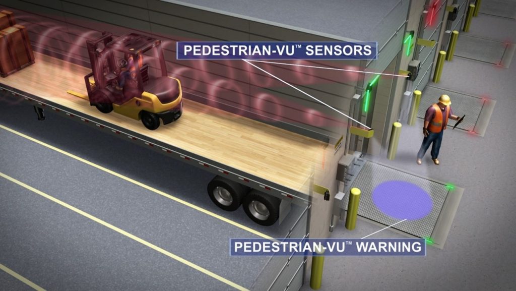 A „Pedestrian VU” észleli a pótkocsi belsejében zajló tevékenységeket az épület padlója felett, a dokkolókapu mindkét oldalán elhelyezett, pótkocsi belsejébe irányuló érzékelők segítségével. Ha mozgást észlel, intenzív, villogó kék fényt bocsát ki a rámpaszint-kiegyenlítőre, amely jelzi a dokkoló személyzetének és a targoncásoknak, hogy óvatosan járjanak el.