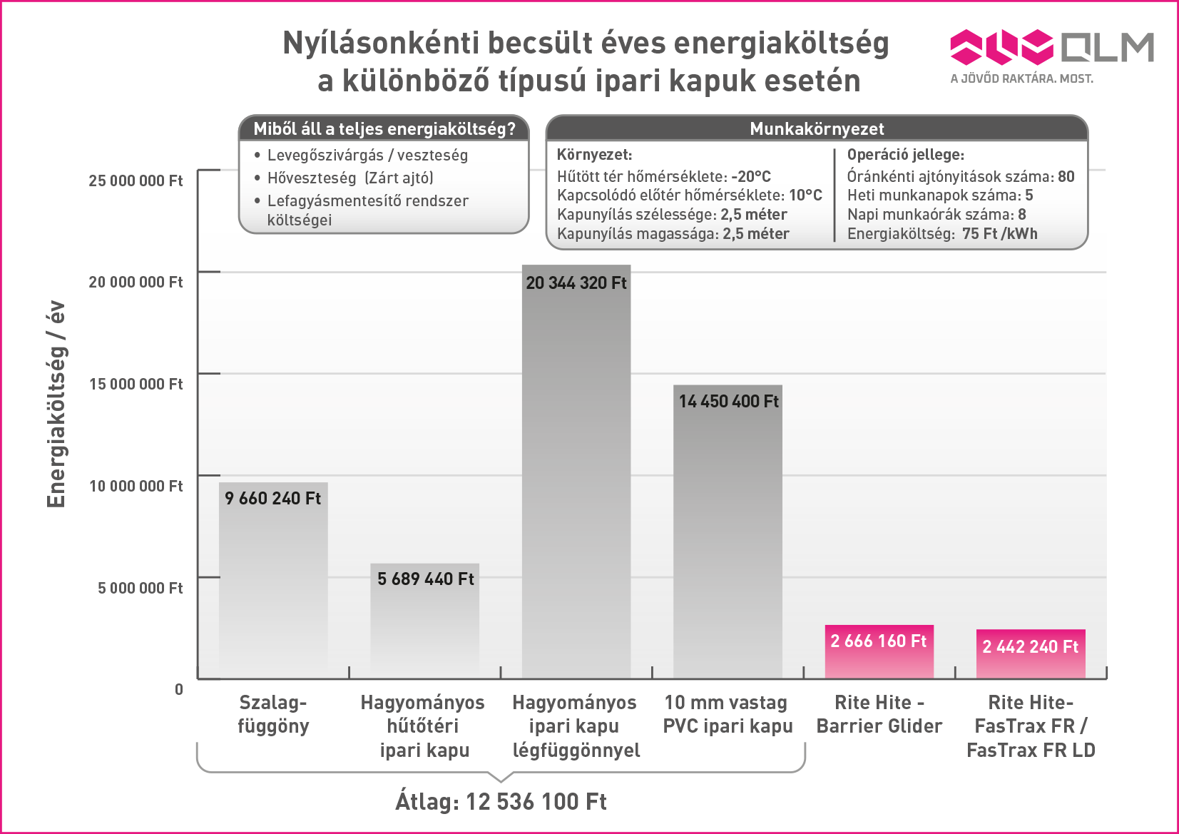 Az alábbi becsült éves energiaköltség diagramján mutatjuk be, hogy a különböző típusú ipari ajtók használata mellett milyen jelentős különbségek jelentkezhetnek egy évre vetítve a költségeket pl. egy hűtött raktár, magas ciklusidő esetén az alábbi paraméterek mellett: